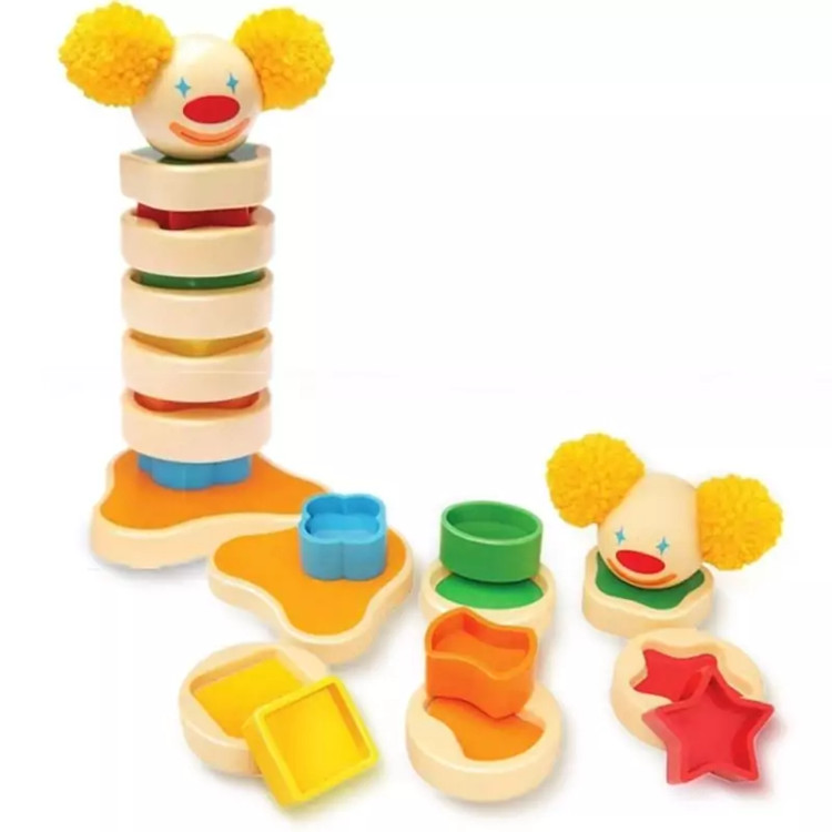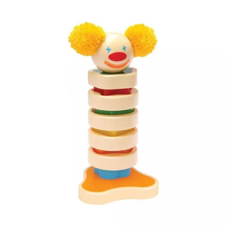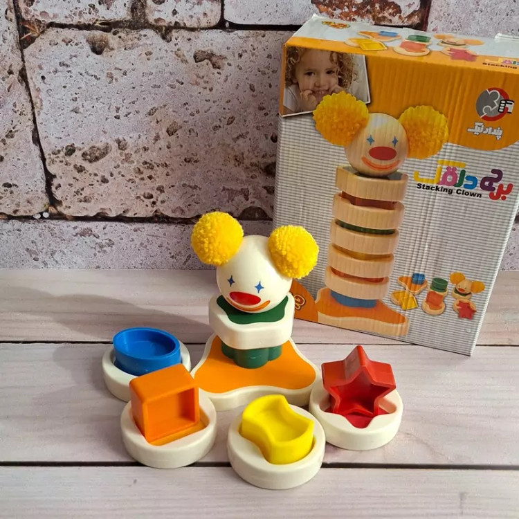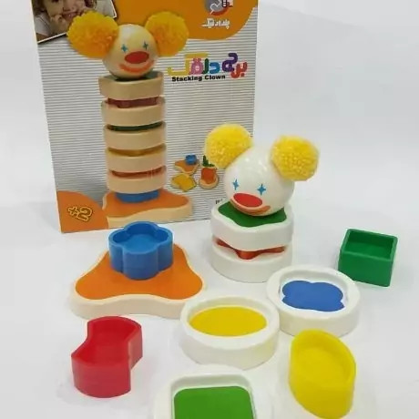 بازی فکری برج دلقک از 5 قطعه رنگی (مربع ، بیضی ، ستاره ، گل و پاپیون) تشکیل شده است. همچنین 5 قطعه ی دایرهای شکل که هروجه آن از نظر رنگ و شکل مشابه یکی از قطعات رنگی میباشد. این اسباب بازی برای سنین بالای 2 سال طراحی شده است. شناخت و تطابق یکی از مهمترین و پایه ای ترین اهداف آموزشی در نوزادان و نو نهالان است. کودک در این سن می تواند اشکال مدور را در جاهای خود قرار دهد و با تلاش شما و خودش بعد از بازی کردن با وسایلی که برای این منظور ساخته شده اند قادر خواهد بود هر شکل را سر جای خودش قرار دهد . کودکان باید این قطعات را با توجه به رنگ و شکلشان به طورمرتب روی هم قرارمیدهند تابرج دلقک ساخته شود. بعد از اتمام کار شما شاهد یک دلقک بامزه هستید. هدف آموزشی برج دلقک : مهارت گرفتن و قرار دادن و هماهنگی چشم و دست. آموزش اولیه ریاضیات از طریق حل مسائل ساده(مرتب سازی) درک ارتباط منطقی اشیاء (کدام قطعه دایره ای به کدام قطعه ی رنگی مربوط است.)