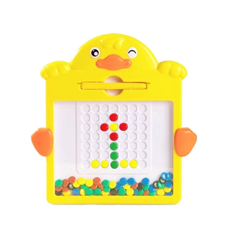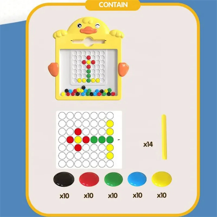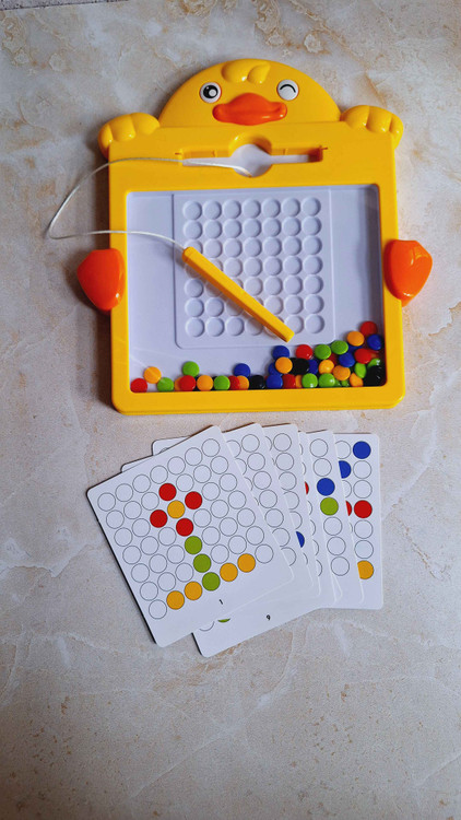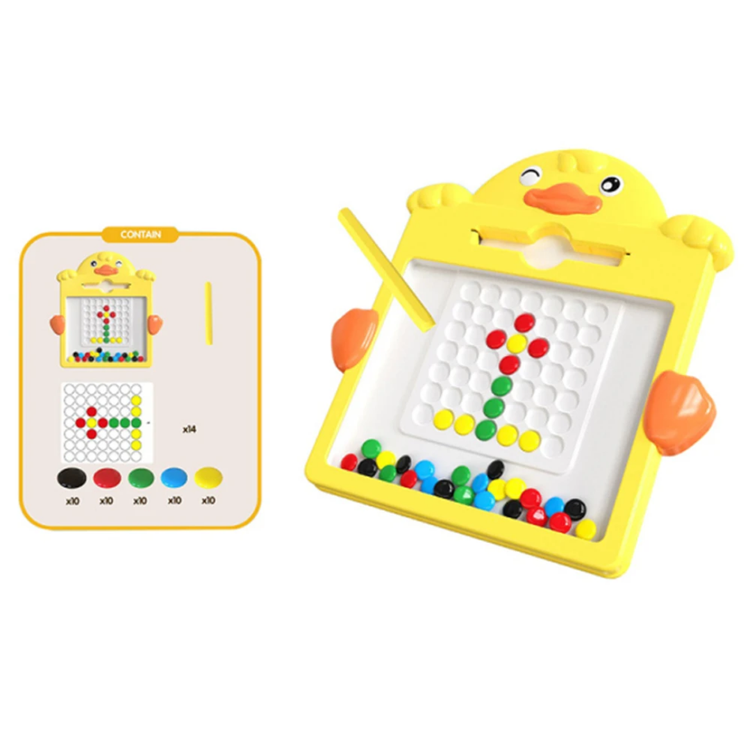 بازی برد مگنتی طراحی حیوانات یکی از بهترین بازی ها برای تقویت دقت و تمرکز، هماهنگی چشم و دست، پرورش خلاقیت و الگو یابی برای کودکان بالای سه سال است. این بازی دارای هفت عدد کارت الگو یابی دو رویه است که کودک می تواند بر طبق آن اشکالی را با استفاده از مداد آهنربایی و مهره های رنگی داخل صفحه بازی بسازد.