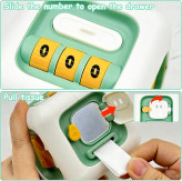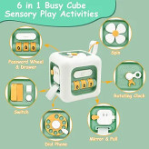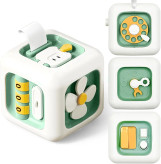 در هر وجه این مکعب دست ورزی چند آیتم برای تقویت انگشتان دست کودک و سرگرم شدن او وجود دارد. این محصول مناسب کودکان بالای 1.5 سال است که از متریال بسیار با کیفیت در دو رنگ سبز پاستلی و صورتی_نسکافه ای ساخته شده.
