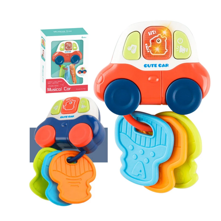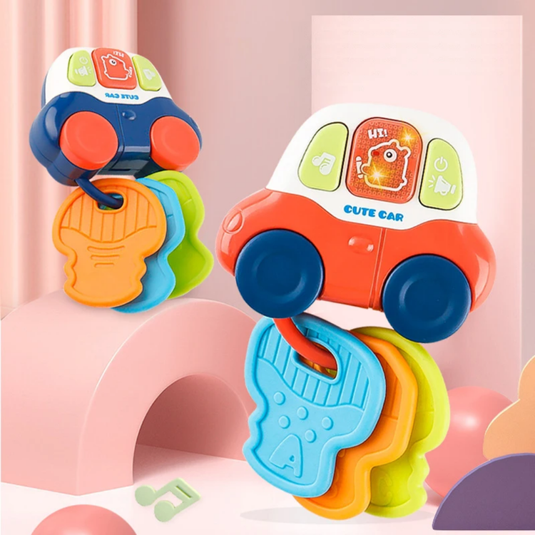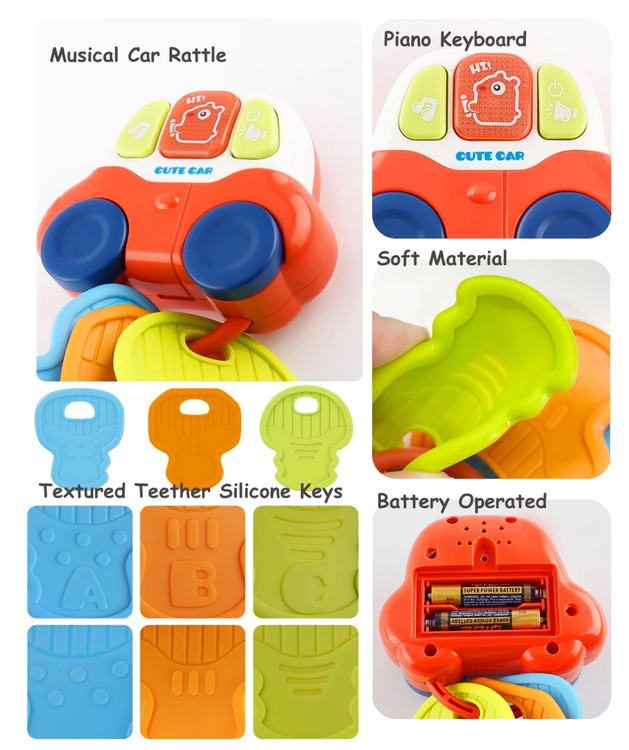 - 🔑 طراحی شبیه ریموت ماشین با کلیدهای رنگی: مناسب برای تقویت مهارتهای حرکتی و هماهنگی چشم و دست