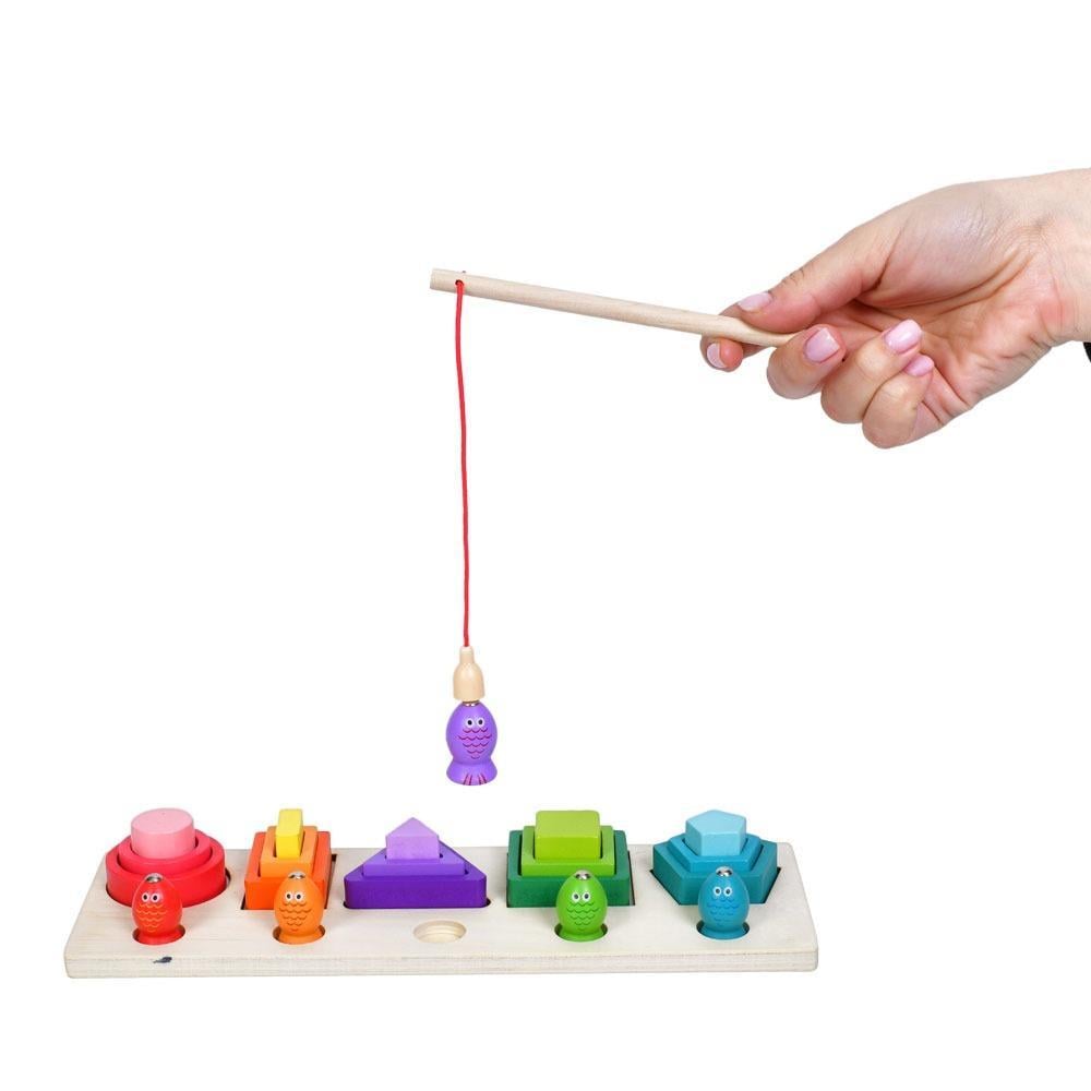 محتویات مدل ماهیگیری : چوب ماهیگیری _ 5 عدد ماهی چوبی مگنتی _ 15 قطعه اشکال در رنگ های مختلف_ پایه ی جایگذاری اشکال