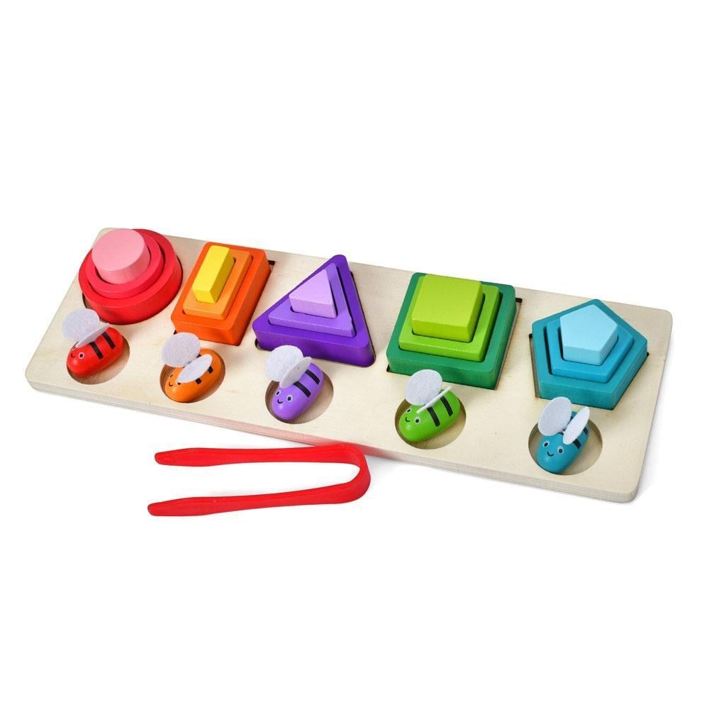 محتویات مدل انبرک دار : 15 قطعه اشکال در رنگ های مختلف _ پایه ی جایگذاری اشکال _ 5 عدد زنبور بال دار _ انبرک پلاستیکی