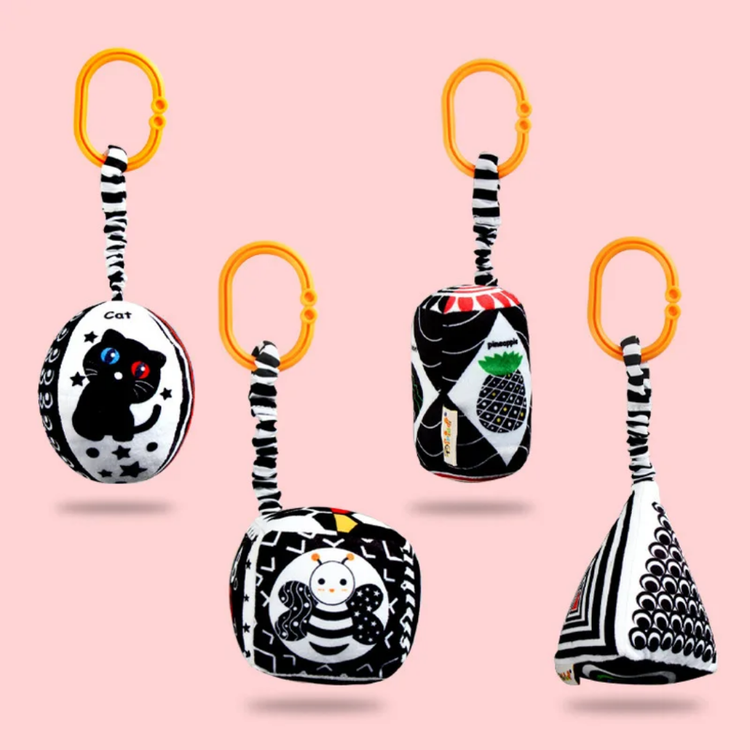 آویزهای پارچهای سیاهوسفید در سه مدل توپی، استوانهای و مکعبی بهترین انتخاب برای تقویت بینایی و تمرکز نوزاد هستند. نوزادان در ماههای اول تنها قادر به تشخیص رنگهای کنتراست بالا هستند؛ به همین دلیل طرحهای سیاهوسفید این آویزها باعث افزایش توجه، تقویت دنبالکردن چشمی و رشد سیستم بینایی میشود.