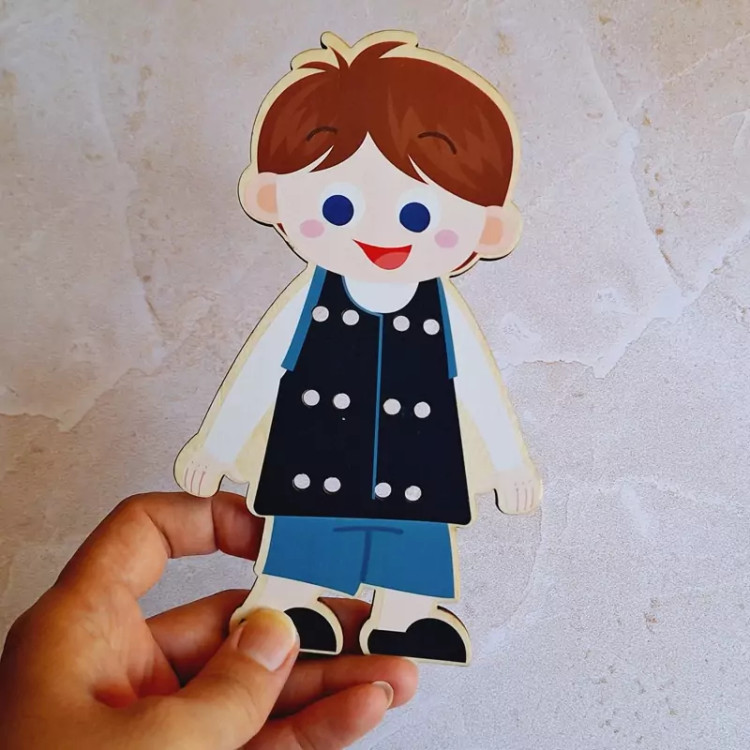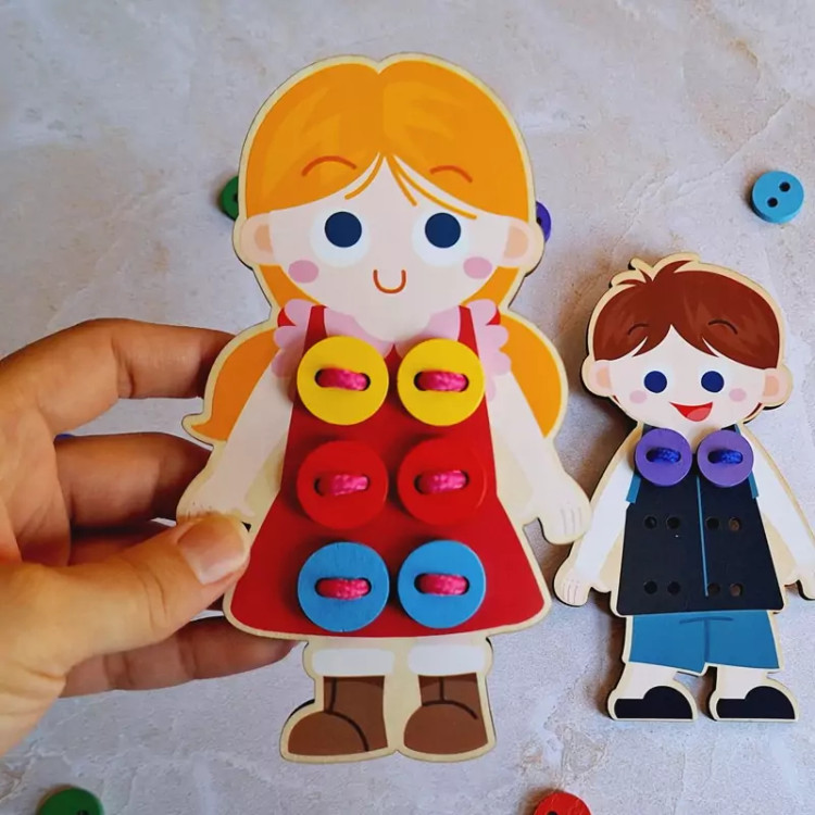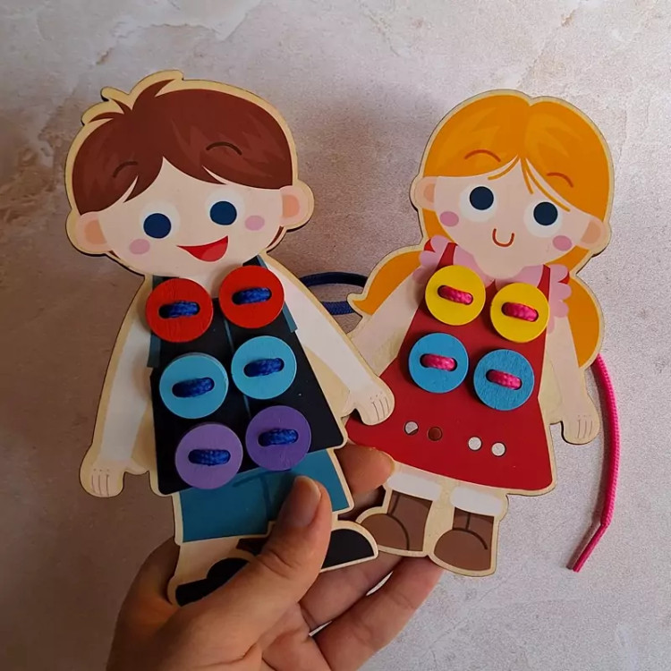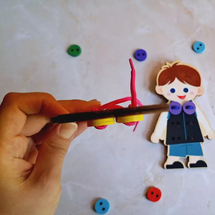 نخ و دکمه چوبی یه بازی چوبی و اقتصادی مخصوص بچه هایی که عضلات دستشون زود خسته میشه🤩 🔶️نخ و دکمه چوبی از یه آدمک چوبی شبیه دختر و پسر و ده تا دکمه چوبی رنگی ساخته شده که روی لباس آدمک جای 6تا دکمه خالیه تا کودک اونارو با نخ مخصوصش به لباس ادمک بدوزه و اینطوری عضلات دست کودک تقویت میشه 🌈این بازی جذاب و اقتصادی تفکیک جنسیتی نداره و مناسب دختر و پسرهای بالای سه ساله 📍مناسب رده سنی بالای سه سال 🔵چه مهارتهایی به دست میاد؟ 🟢تقویت عضلات ظریف دست 🟢تقویت دقت و تمرکز 🟢هماهنگی چشم و دست