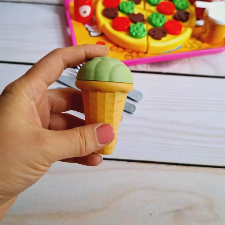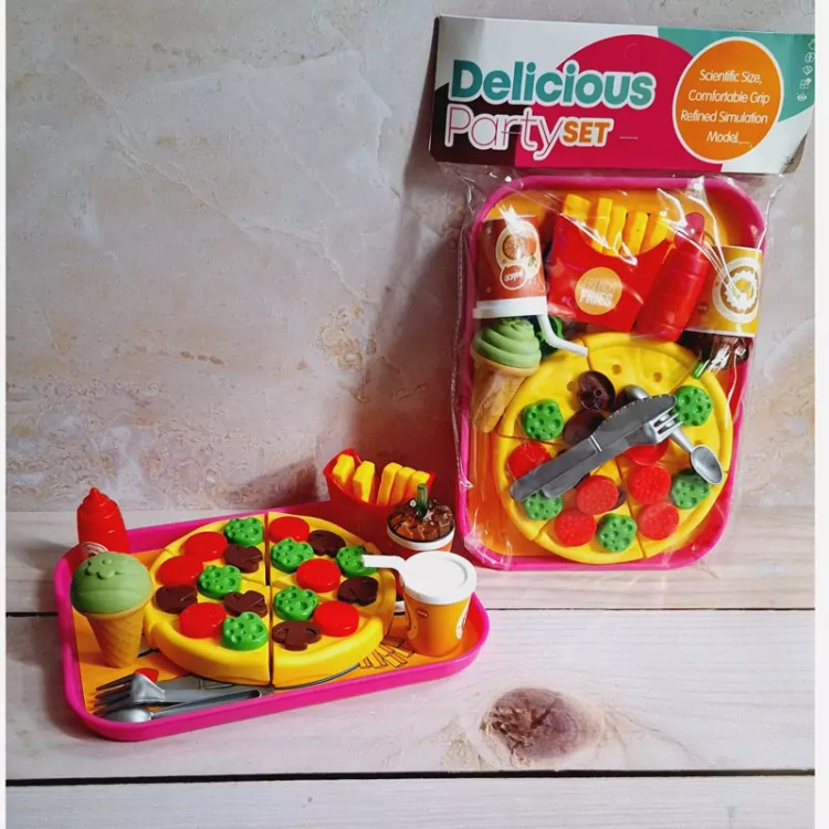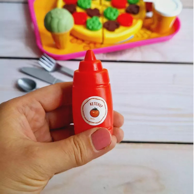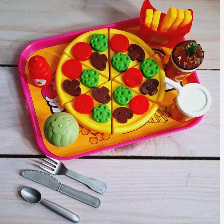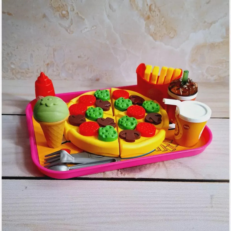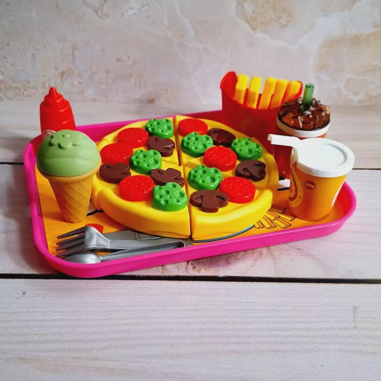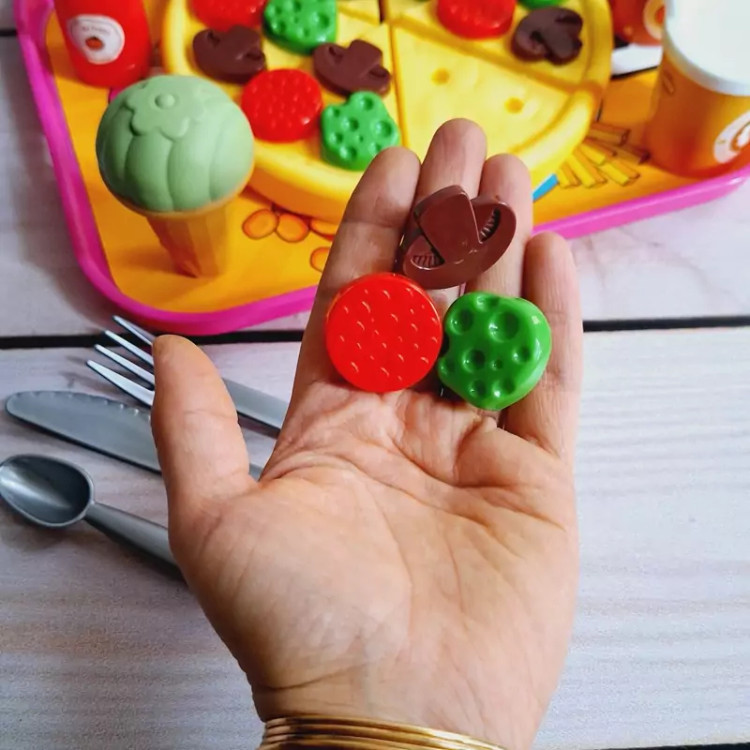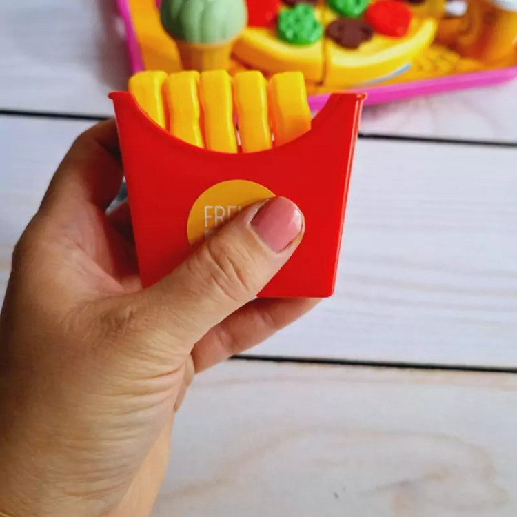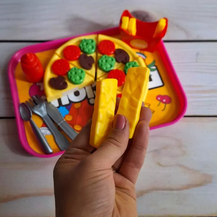 ست اسباب بازی فست فودی برای کودکان بسیار جذاب است چرا که شکل و شمایل آن ها با فست فودهای واقعی مشابه است و کودکان دوست دارند با وسایل واقعی بازی کنند و این مشابهت آن ها را خوشحال خواهد کرد. برشی بودن وسایل بازی نیز کمک می کند کودک عضلات دست خود را تقویت کند و مهارت های حرکتی خود را بهبود بخشد. ضمنا مهارت های نقش آفرینی را در این زمینه بهتر ایفا خواهد نمود. این بازی برای کودکان 3 سال به بالا مناسب است و دارای چندین قطعه اسباب بازی است. وسایلی نظیر پیتزا، نوشابه، سیب زمینی سرخ کرده، بستنی و ... که کودک می تواند با این وسایل بازی کند، ادای کشیدن غذا و خوردن غذاهای خیالی را دربیاورد و به حس خلاقیت خود پر و بال ببخشد. جنس محصول پلاستیکی و کاملا بی خطر است و لبه های تیزی برای کودک ندارد و خیال پدران و مادران عزیز از این جهت کاملا راحت خواهد بود و ایمنی کودکان با این وسیله بازی تامین می باشد و جای هیچ گونه نگرانی نخواهد بود. نحوه استفاده از اسباب بازی های برشی: این نوع اسباب بازی ها دارای شیاری برای برش هستند و کودک می تواند با استفاده از چاقوی موجود در بسته بندی آن ها را برش دهد و دوباره به هم بچسباند. ویژگی های اسباب بازی های فست فود برشی: تقویت خلاقیت و تخیل کودک یادگیری مهارت های جدید در زندگی ایجاد حس کنجکاوی در کودک کسب مهارت های عاطفی و اجتماعی مقابله با اضطراب و تنش ها تقویت عضلات دست هنگام برش با چاقو پرورش قدرت انطباق اشکال